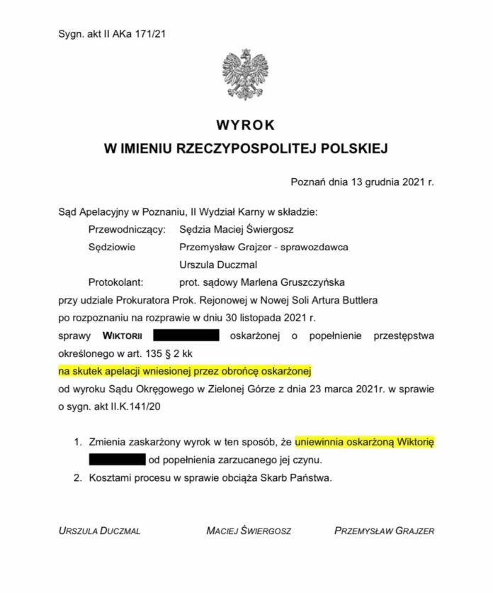 – Po 1,5 roku, po nielegalnym zatrzymaniu, po nagonce medialnej, po długim procesie, w 40-tą rocznice ogłoszenia stanu wojennego, Niezawisły i Niezależny Sąd Apelacyjny w Poznaniu, na skutek mojej apelacji, UNIEWINNIŁ Wiktorię od zarzutu znieważenia Prezydenta RP Andrzeja Dudy w czasie wiecu wyborczego w Nowej Soli w 2020 r.! Warto jest walczyć do końca… – napisał mec. Robert Kornalewicz – obrońca kobiety.